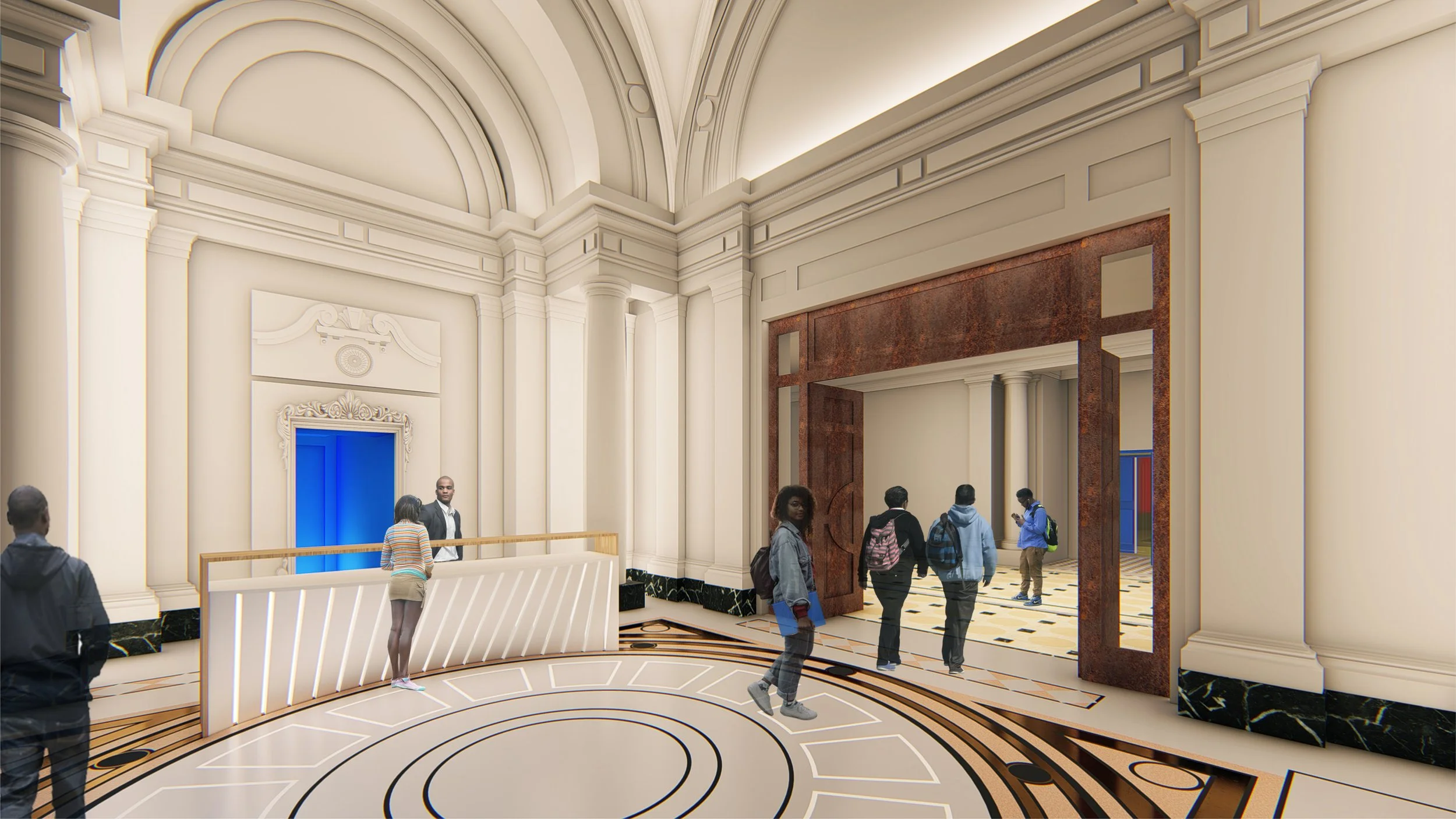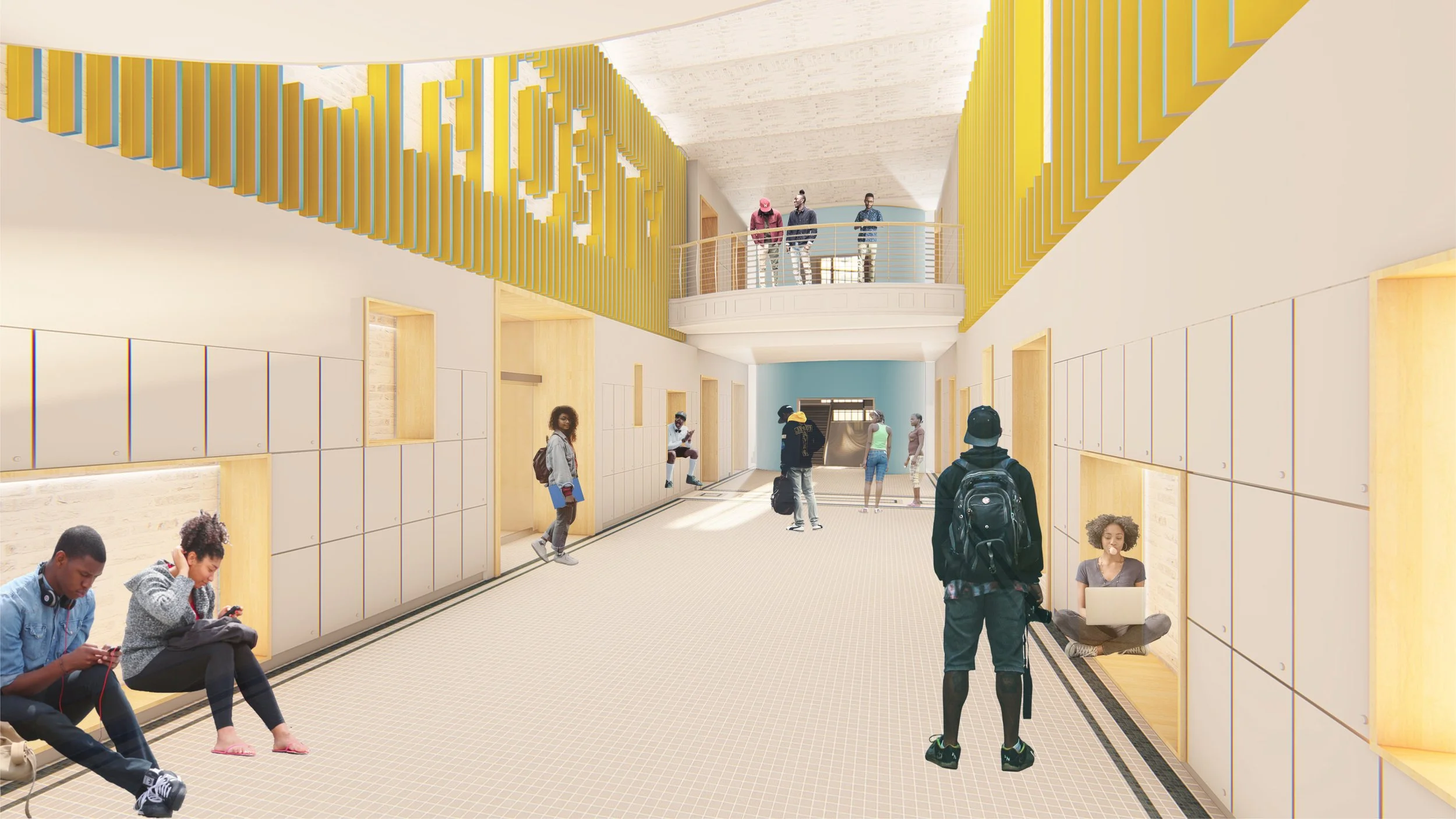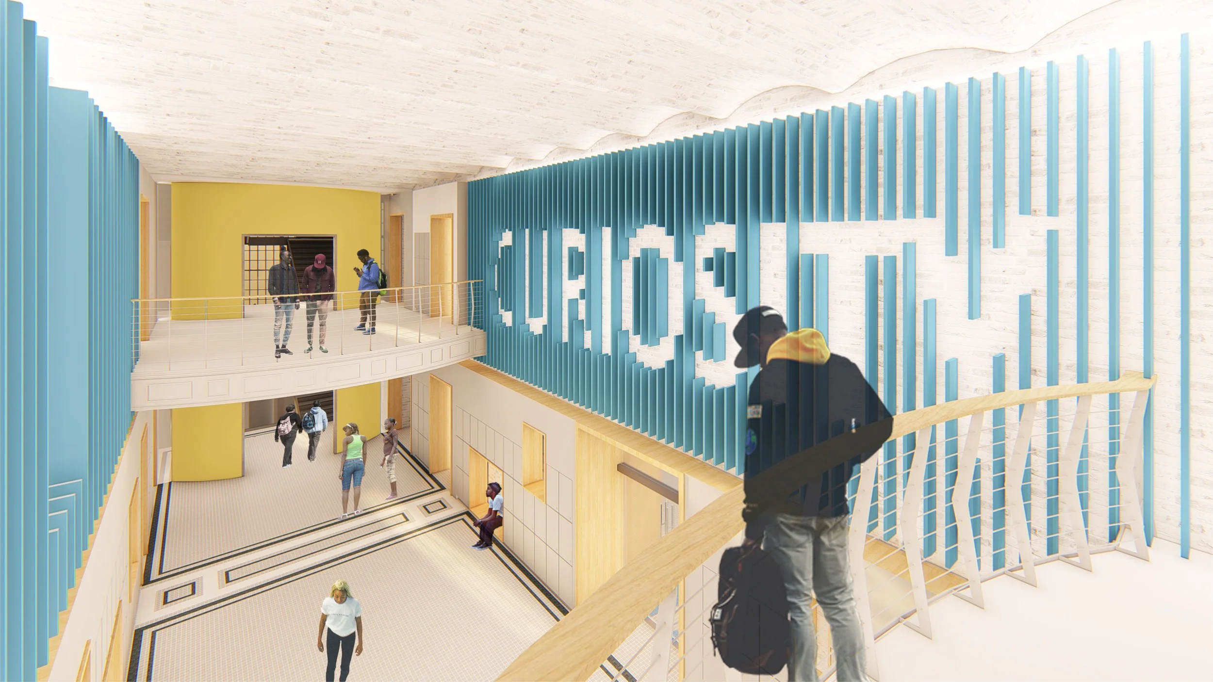 The Vertical Quadrangle as seen from the Mezzanine. One of Success Academy's five action values is artistically represented on the wall using a lenticular optics.