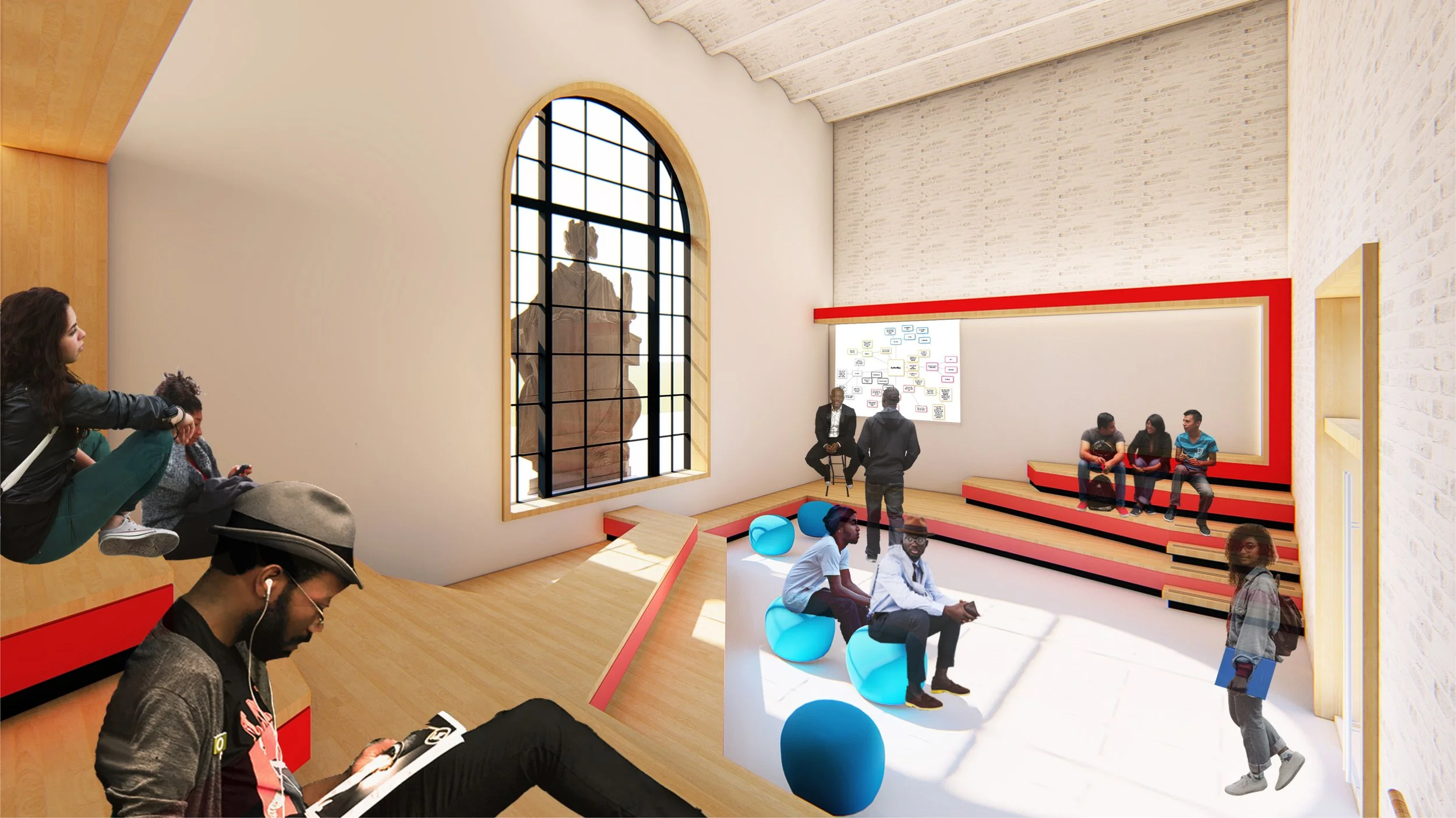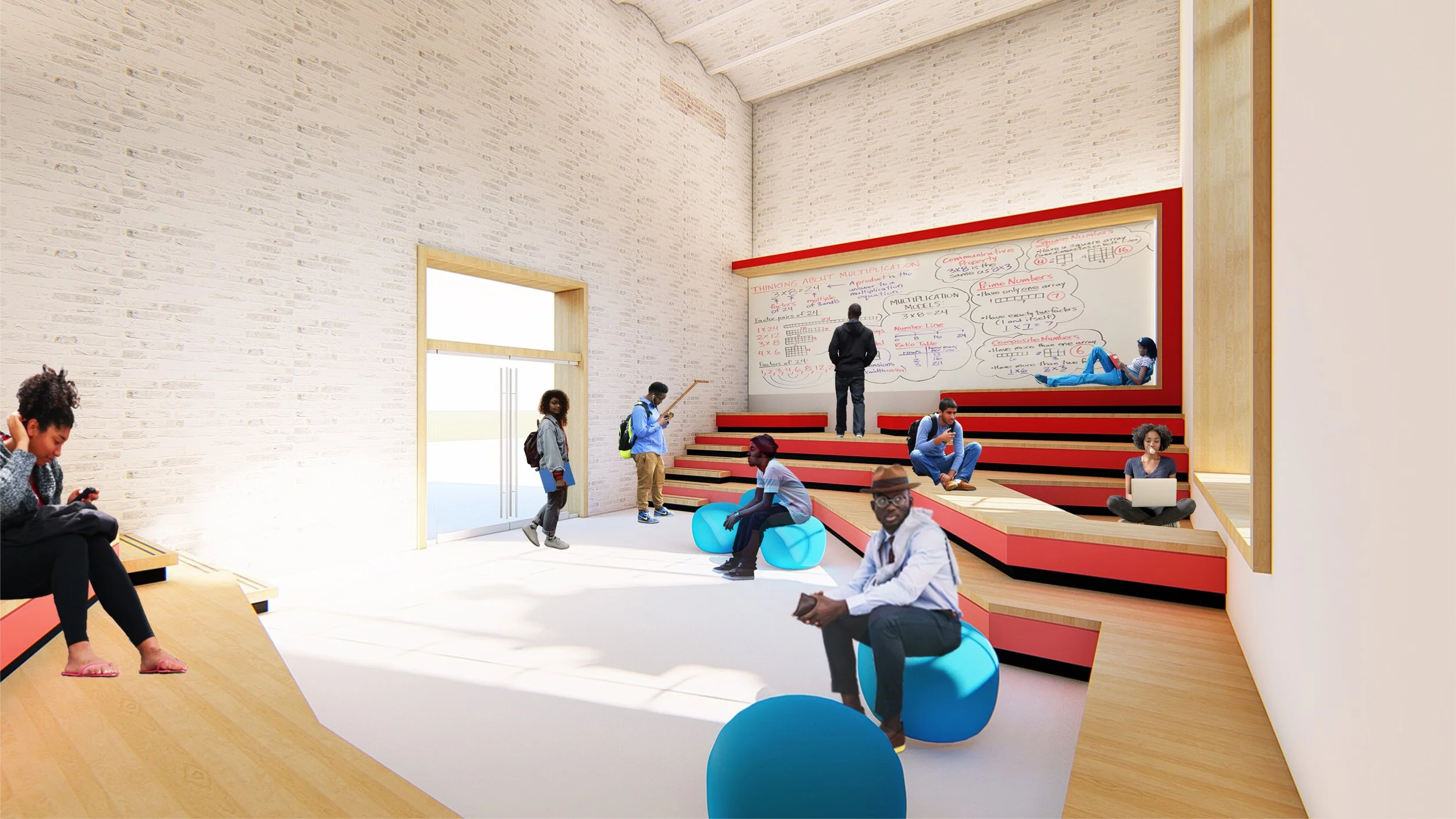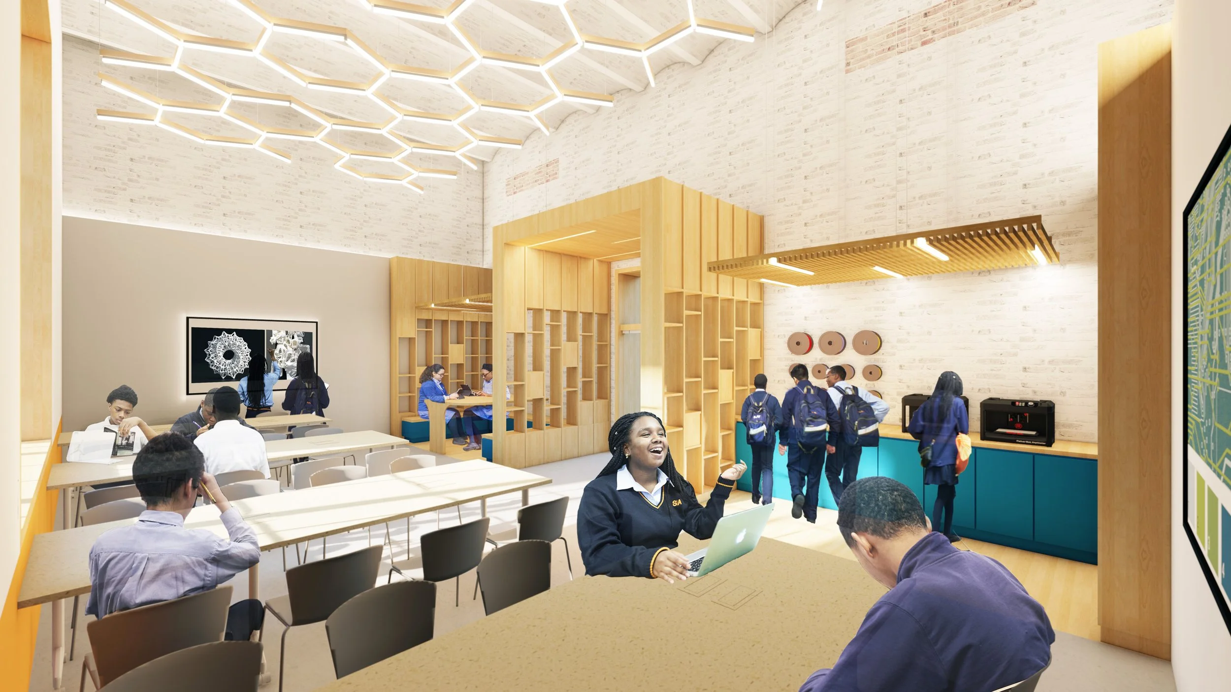 The Vertical Quadrangle as seen from the Mezzanine. One of Success Academy's five action values is artistically represented on the wall using a lenticular optics.