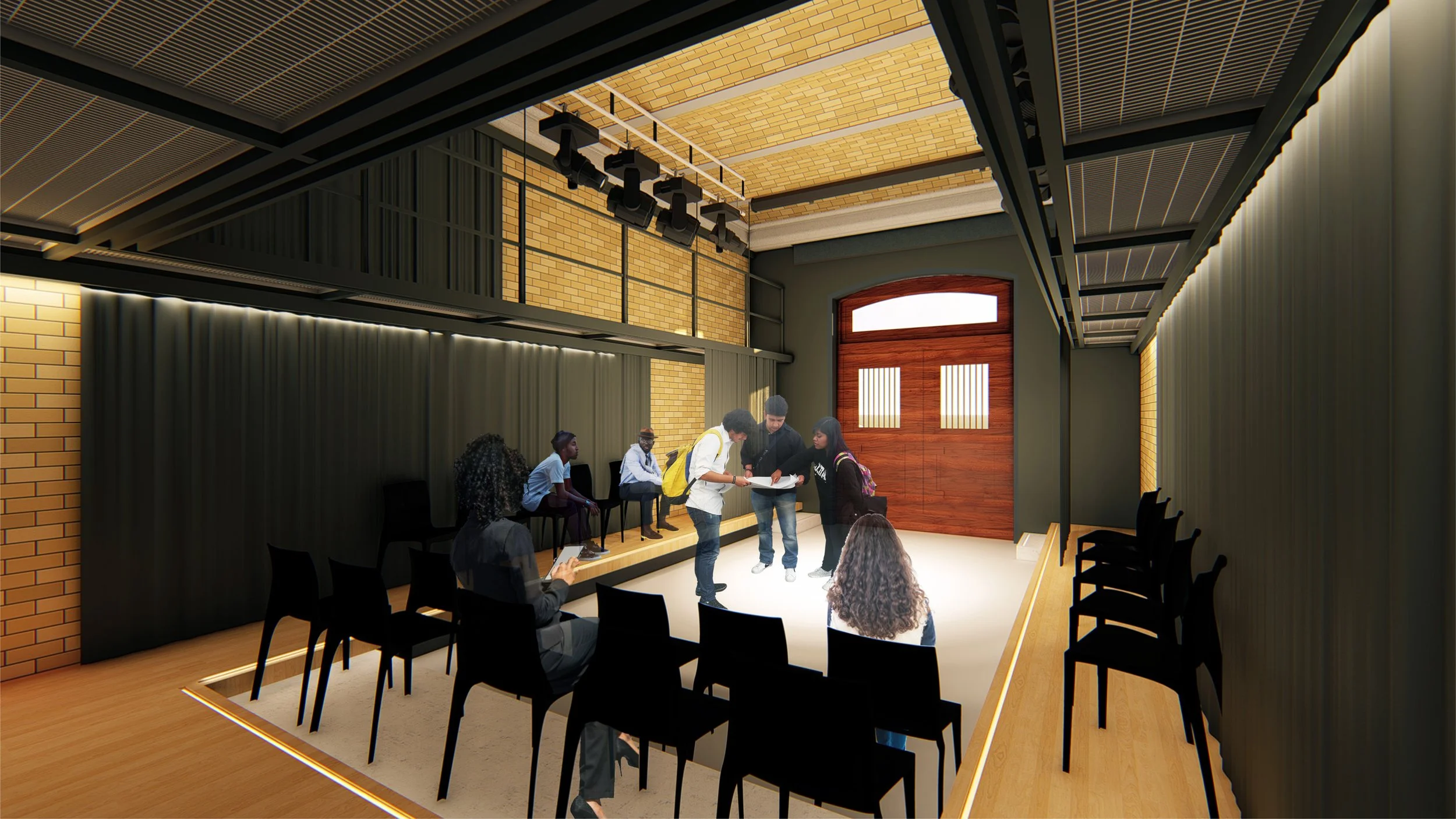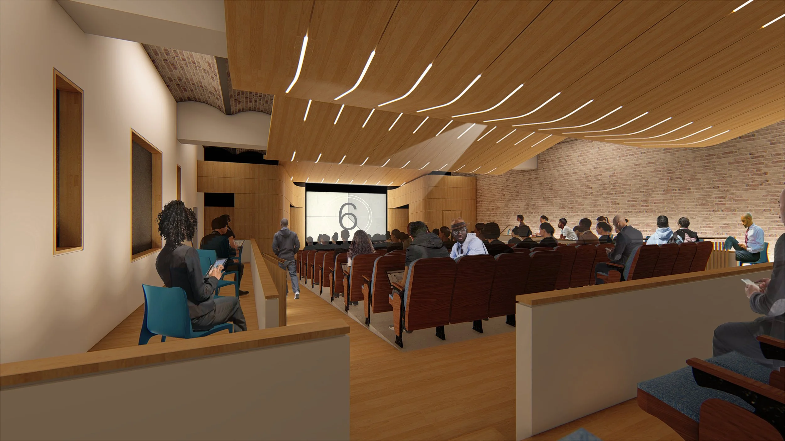 The Music Classroom with articulated walls and ceiling to refract primary reflections of voice and music. Walk-along drapery runs along the opposite wall to help tune the room.